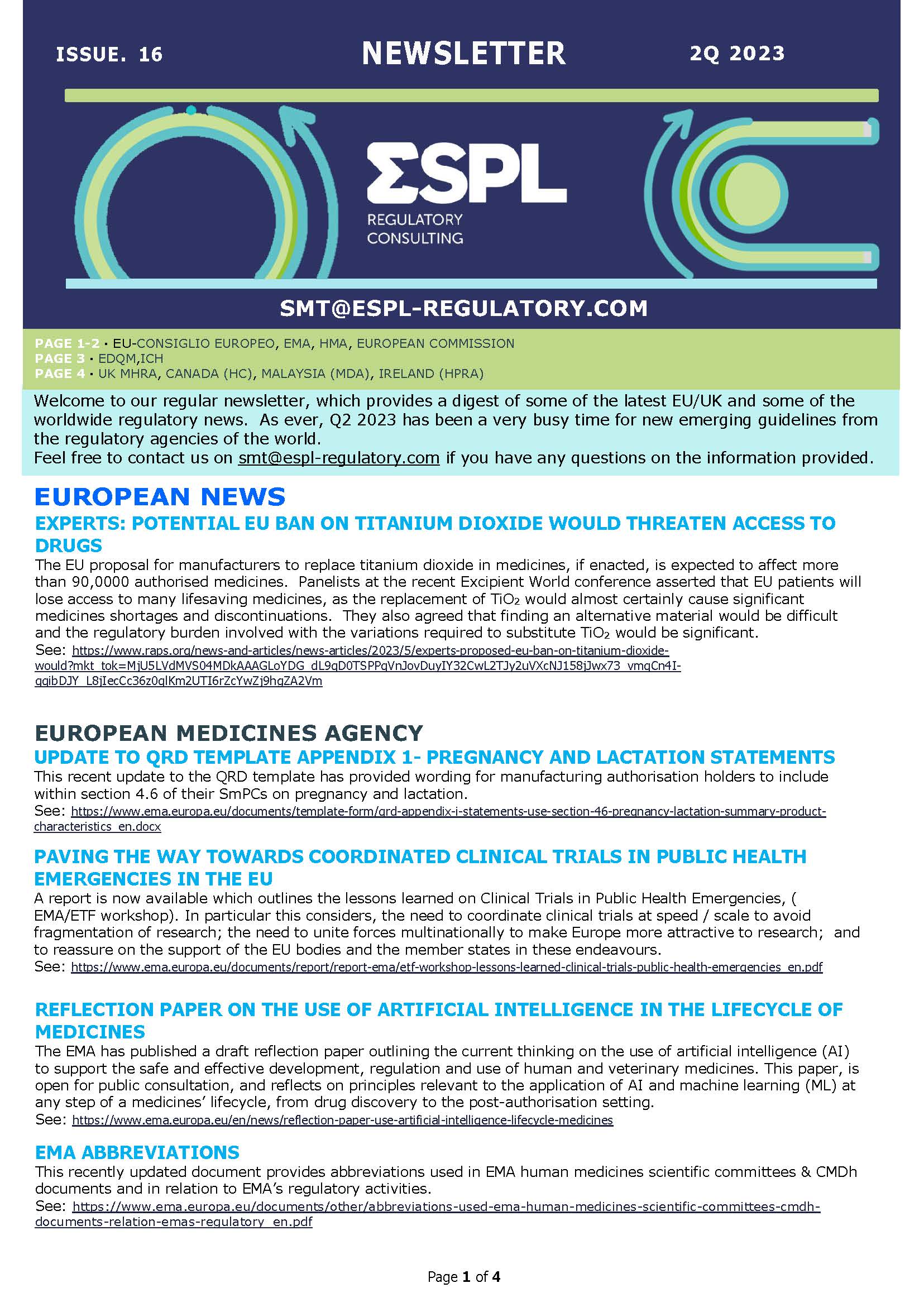 As part of the new contacts and professional growth of ESPL, a regular news letter is made to keep ESPL contacts upto date with European news. Please see below. A link has been attached if you’d liked to download and share internally.